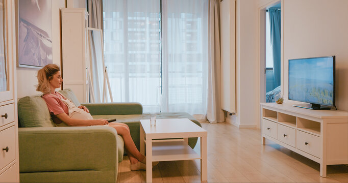 Beautiful pregnant woman watching movie alone sitting on the sofa. Sitting at home enjoying the self time. Happy Family Concept