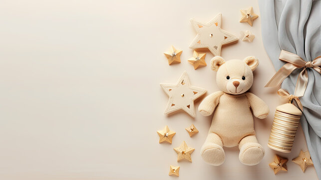 top view of a teddy bear and stars. baby boom concept. with copy space template for designers.