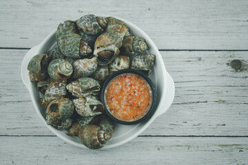 Steamed Spotted Babylon Blanching (Fresh Sea Babylonia Areolata Shell Boiled) served with passion fruit sauce goodtasty decorated with spices side view
