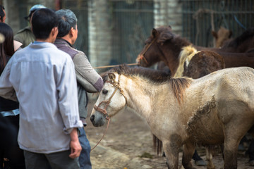 Horse livestock trading in Bac Ha market in the rural town of Lao Cai near Sapa Vietnam Asia