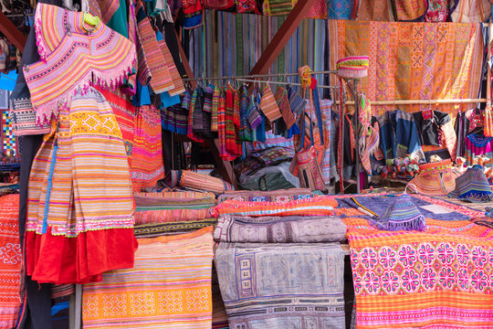 BAC HA, VIETNAM - September 21, 2014: A local woman, dressed in vibrant traditional attire, visits the bustling Sunday market in Bac Ha