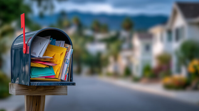 An overfilled suburban mailbox bursting with multicolored envelopes, some peeking out at angles, paper corners curling gently, shallow depth of field with a blurred residential bac