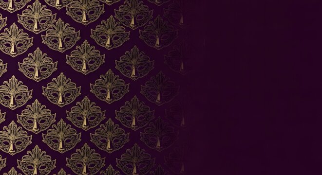 Repeating gold Venetian carnival mask pattern on deep purple bac