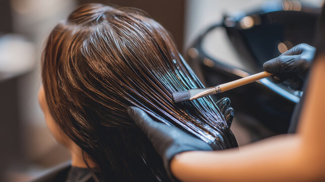 Faceless hairdresser applying hair dye to customer in salon, professional hair coloring stock photo, beauty treatment, chemical application, salon service, hair care, defocused bac