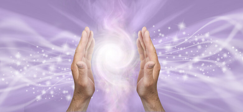 Light worker sensing double Fibonacci high vibration healing energy field  - male parallel hands against a lilace bacgkround and copy space for spiritual message