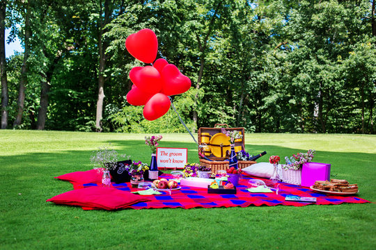 Picnic table and decor at bachelorette party on the nature. Rockabilly hen-party in park. Group of friends at park having fun party.
