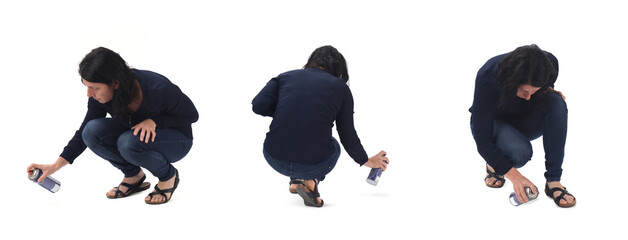 side,back and front view of same woman painting on the floor with spray on white background
