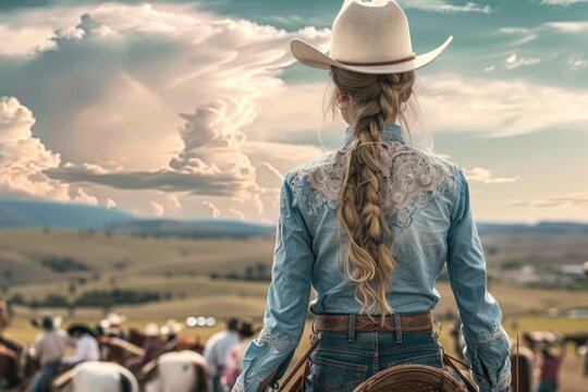 A cowgirl in a denim shirt and cowboy hat stands with her back to the camera, gazing at a scenic view of rolling hills and a distant ranch under a golden hour sky