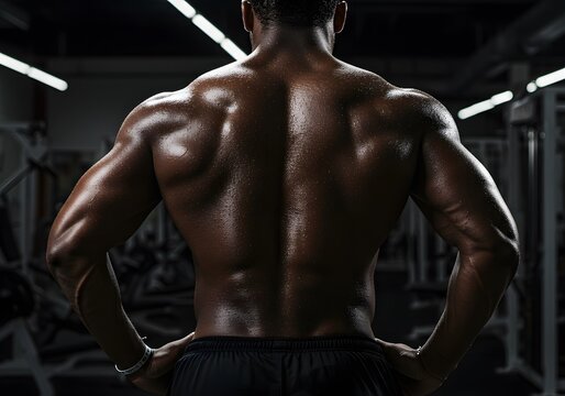 African bodybuilder showcasing muscular back in gym, strength and dedication. bodybuilder,  muscular,