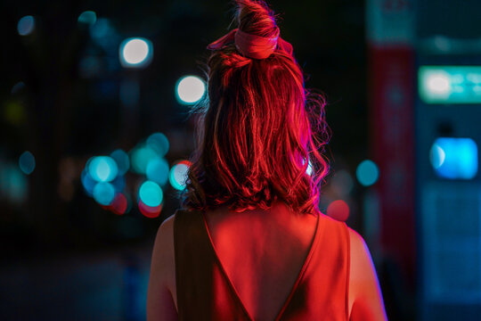 portrait of young woman with her back to camera at night