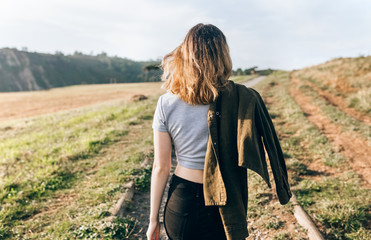 Couple holding hands walking along sunny beach woman reaching back in yellow dress