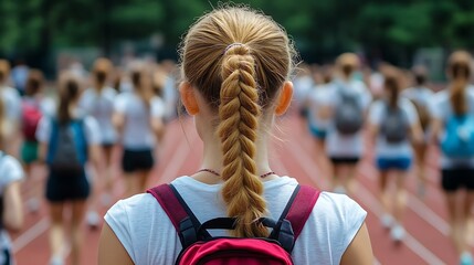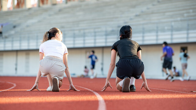 Back view shot of asian woman and friend sitting crouching before running on track in sports stadium