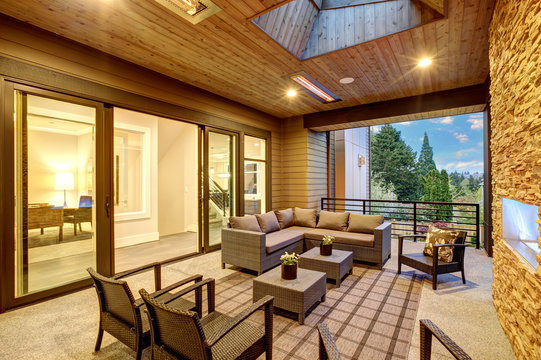 A luxurious and inviting covered back porch designed as a sophisticated outdoor living room. A large, comfortable sectional sofa with plush cushions is arranged around a modern gas fire pit table, whi