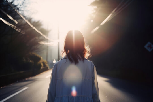 Pensive woman walking on autumn forest road with swirling falling leaves, moody portrait