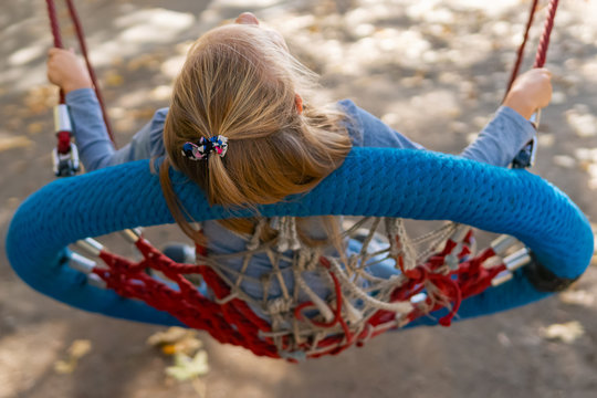 A little girl swings on a wooden swing in the park on the playground. Back view. Outdoor activities