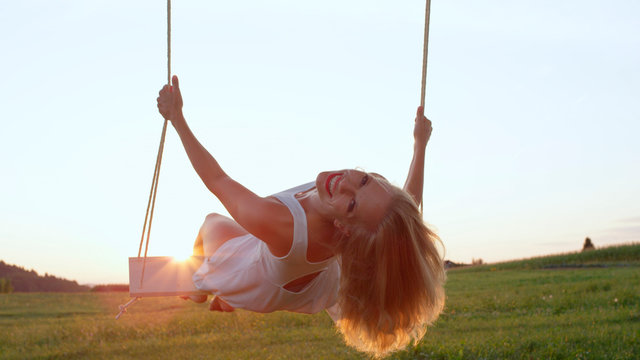 SLOW MOTION CLOSE UP: Happy young woman smiles and leans back on swing in nature