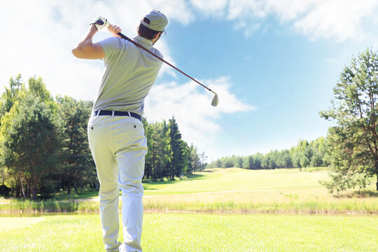 Mature, man and swing on golf course or nature for recreation sport, practice and training for tournament match. Male golfer, country club and back with workout for coordination and exercise.