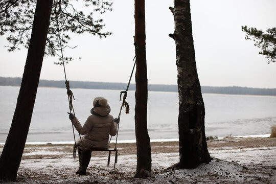 elderly senior retired woman in the forest, background view of a woman from the back on a swing tied to a tree against the backdrop of a lake or river, in winter, unrecognizable