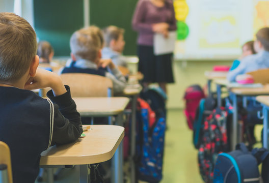 Rear view of school children sitting at the desk in classroom, raising hands.