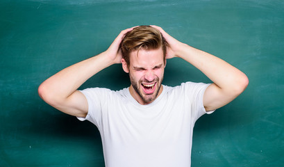 Never give up. prepare for exam. back to school. education abroad. Student exchange. student man in classroom. University exchange. man at blackboard. Knowledge day. college life. young tutor