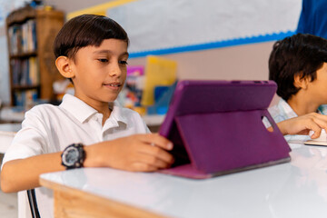 Portrait school boy using digital device in school classroom.