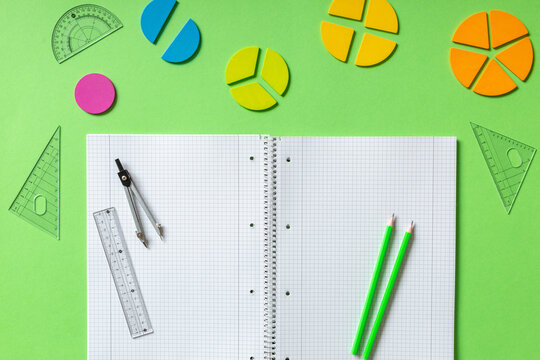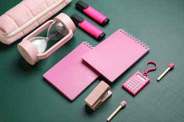 School office supplies stationery on a green background desk with white paper above copy space. Back to school concept.