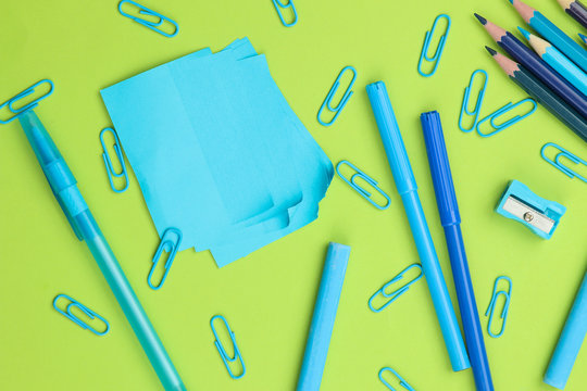 back to school. stationery, school supplies, blue pencils, paper clips and stickers on a bright green background. top view. minimalism