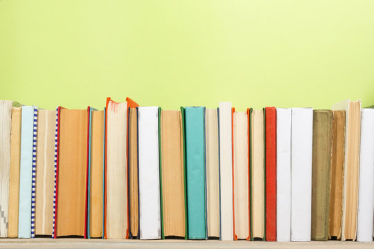 Colorful composition with vintage old hardback books stacking, diary on wooden deck table and green background. Back to school. Copy Space. Education.