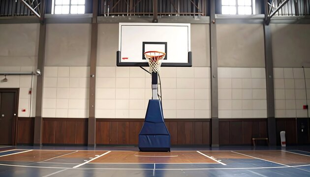 A detailed shot of an empty indoor basketball court with the backboard and hoop centered. The flooring showcases a multi-tone design