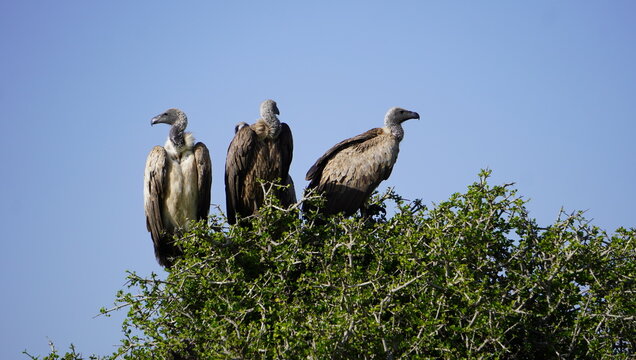 A black backed vulture and a white backed vulture are perched on a wild tree branch showing their wings, feathers, and beaks in a natural wildlife setting among other avian species