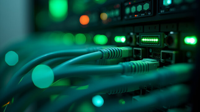 Network Server Rack with Ethernet Cables: Green Lights, Data Center Connectivity, IT Infrastructure, Technology, Close-Up View