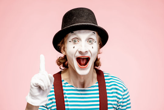 Portrait of an actor as a pantomime with white facial makeup posing with expressive emotions on the pink background indoors