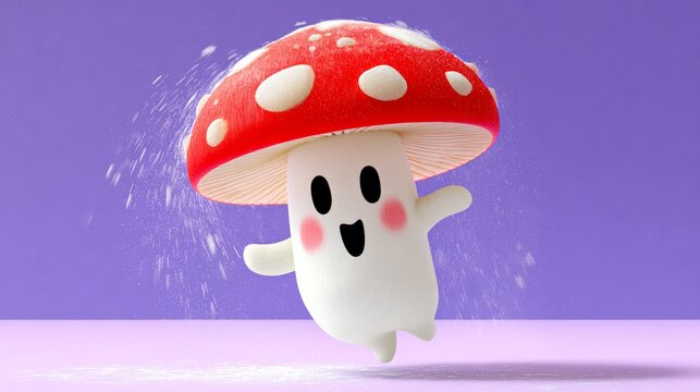 A cute animated mushroom character with a red cap and white spots, smiling and jumping against a purple background