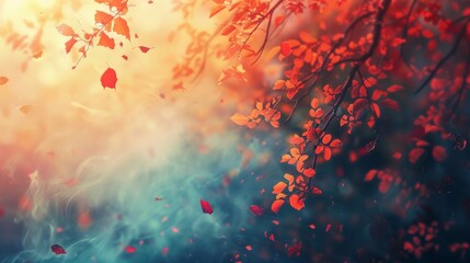 A mesmerizing autumn background featuring a lush forest scene bathed in the warm glow of the setting sun. Vibrant red leaves cascade from the branches, swirling in the gentle breeze.