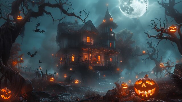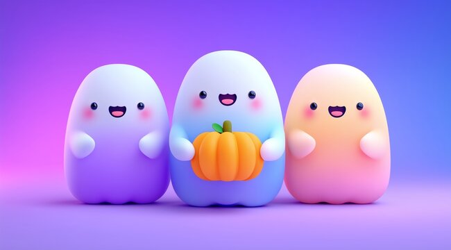 Three adorable, animated ghosts in pastel colors, holding a pumpkin against a vibrant gradient background.