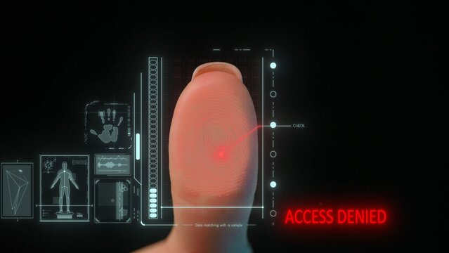 Woman thumb finger touching glass screen panel and activating holographic safety interface, identity scanner scanning fingerprint showing access denied.