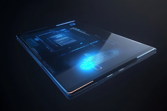 High-Definition Floating Touchscreen With Fingerprint Scanner, Biometric Layers, And Data Transfer Animations Rendered In Crystal-Clear Detail; Left-Side Copy Space, Black Background --Ar 3:2 --S 50