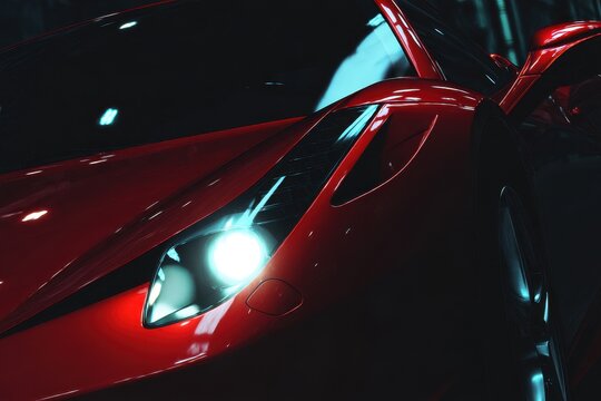 The spotlight is on a red sports car, which appears shiny, new, and luxurious, set against black