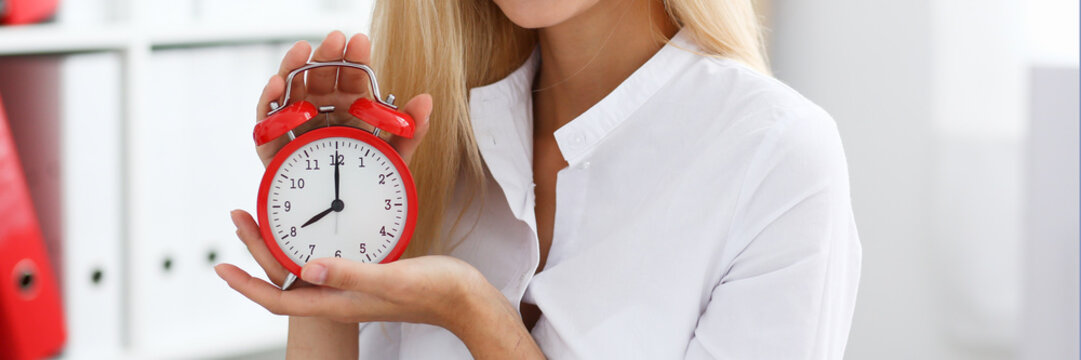 Smiling business woman holding in hand on the alarm clock a red color showing eight o'clock in the morning or evening AM PM