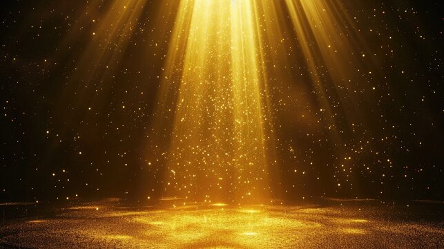 Stage light and golden glitter lights on floor. Abstract gold background for display your product. Spotlight realistic ray.