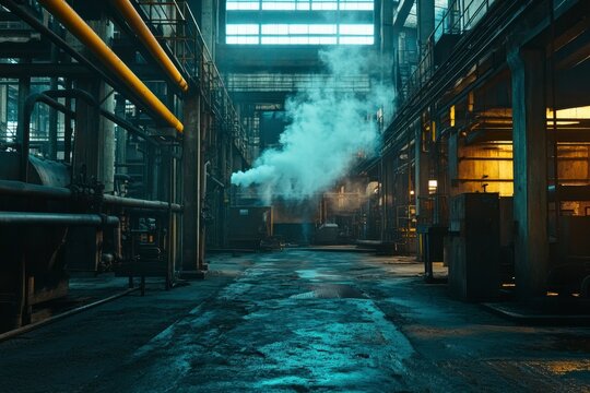 Industrial Interior with Steam: Dark Factory Hallway with Pipes and Metal Structures