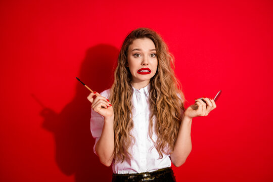 Young woman with vibrant makeup holds tools in hands against red background expressing confusion and hesitation