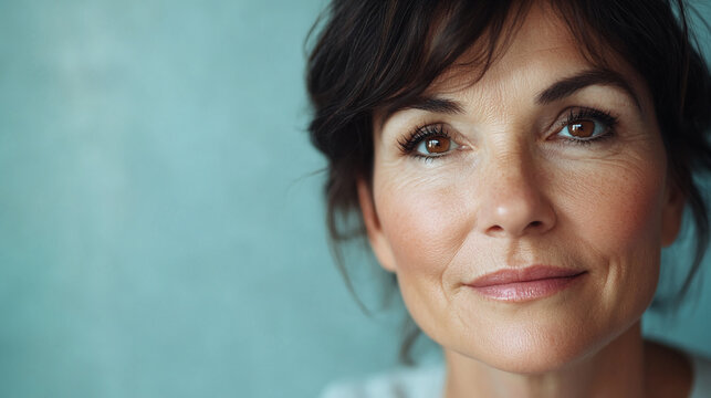 Close-up of woman's face, showcasing her brown eyes and subtle lines, conveying maturity and natural beauty against a teal background
