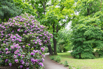 Germany, Saxony, Leipzig, Large rhododendron bush flowering in Palmengarten park with oak trees in background
