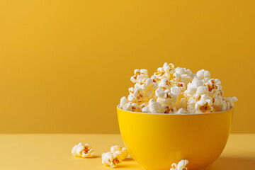 Popcorn in yellow bowl on yellow background with copy space. Cinema concept. Generative AI