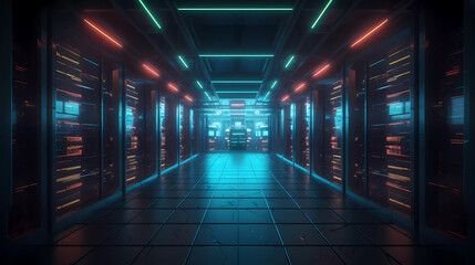 Glowing server racks creating neon corridor of blue leds in high-density data center
