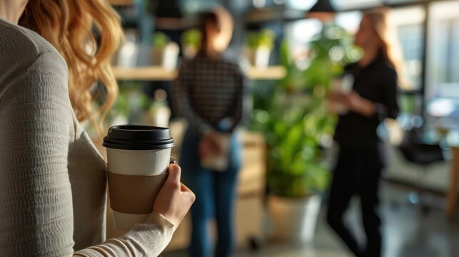 Colleagues chatting in coworking lounge with coffee, casual business conversation