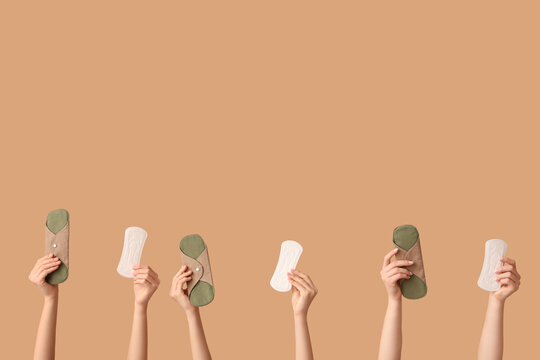 Many female hands with menstrual and reusable pads on beige background