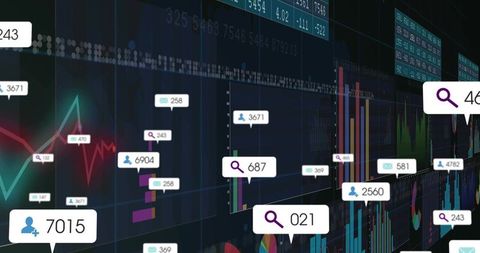 Neon financial analytics dashboard displaying interactive charts, callouts and data streams