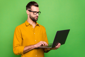 Profile side view portrait of his he nice attractive focused intelligent bearded guy in formal shirt holding in hands digital netbook isolated on bright vivid shine vibrant green color background